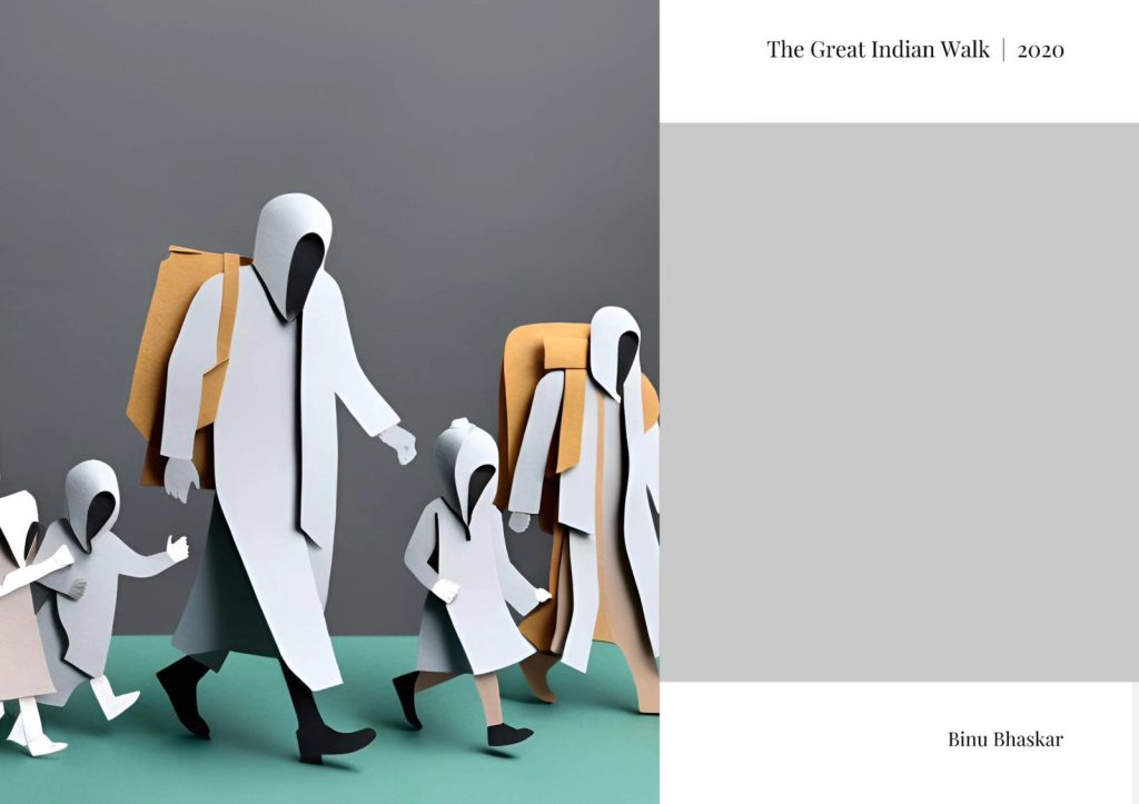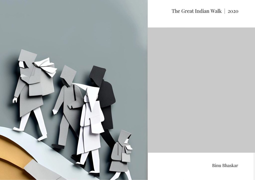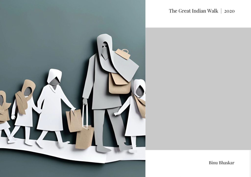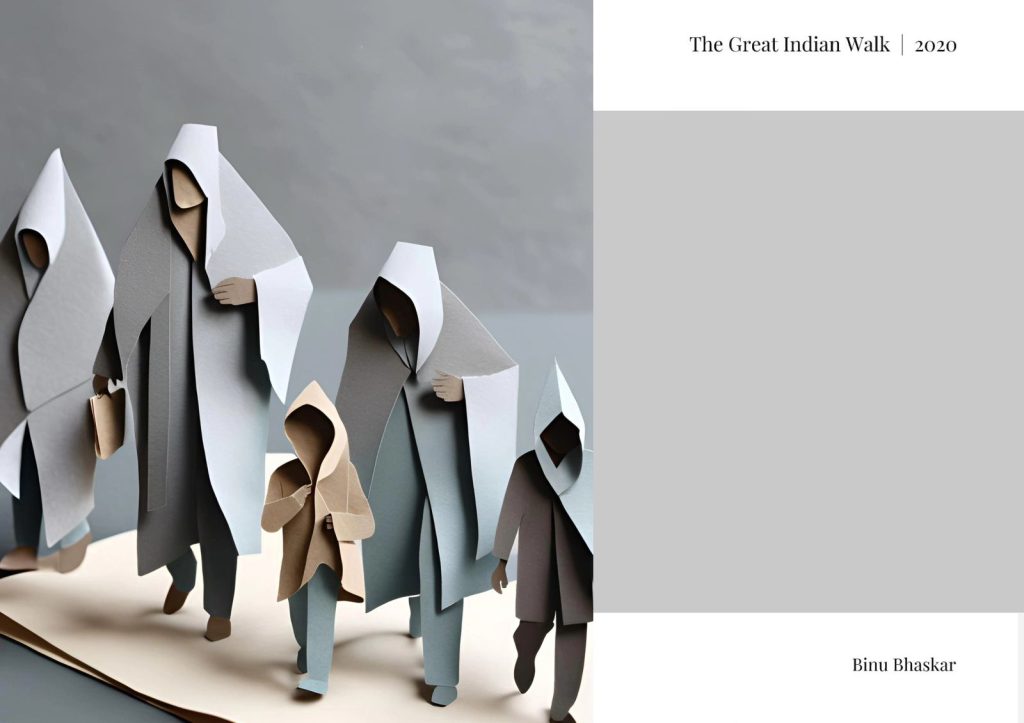 Stripped of facial identity yet full of human weight, these minimalist figures echo the silent determination of millions who walked home during the 2020 migrant crisis.
